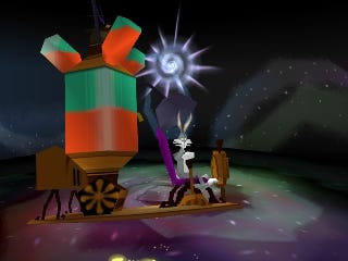 15 years later I finally managed to get a hold of the game and play it all (told you!) The plot of the game is a twist of 1955’s Knight-Mare Hare. While trying to find his way to Pismo Beach and not turning right at Alberquerque, he winds up in a shed that houses a time machine. Accidentally turning it on, he’s then transported in time to Nowhere Land and meets Merlin Munroe. The story plays, or rather replays, a lot of the same old gags as Knight-Mare Hare like when Bugs first meets with Merlin and he tries his hokey tricks on him. The game even ends the same way where Bugs thinks none of what happened really happened and then hears a nearby farmer callng his mule Merlin, shaking him nervously. Just like the cartoon. Interestingly, if you complete it without all 128 clocks your end credits scene takes place in a foresty area at night. But if you complete it all 100% you’re greeted with the credits scene at Pismo Beach.