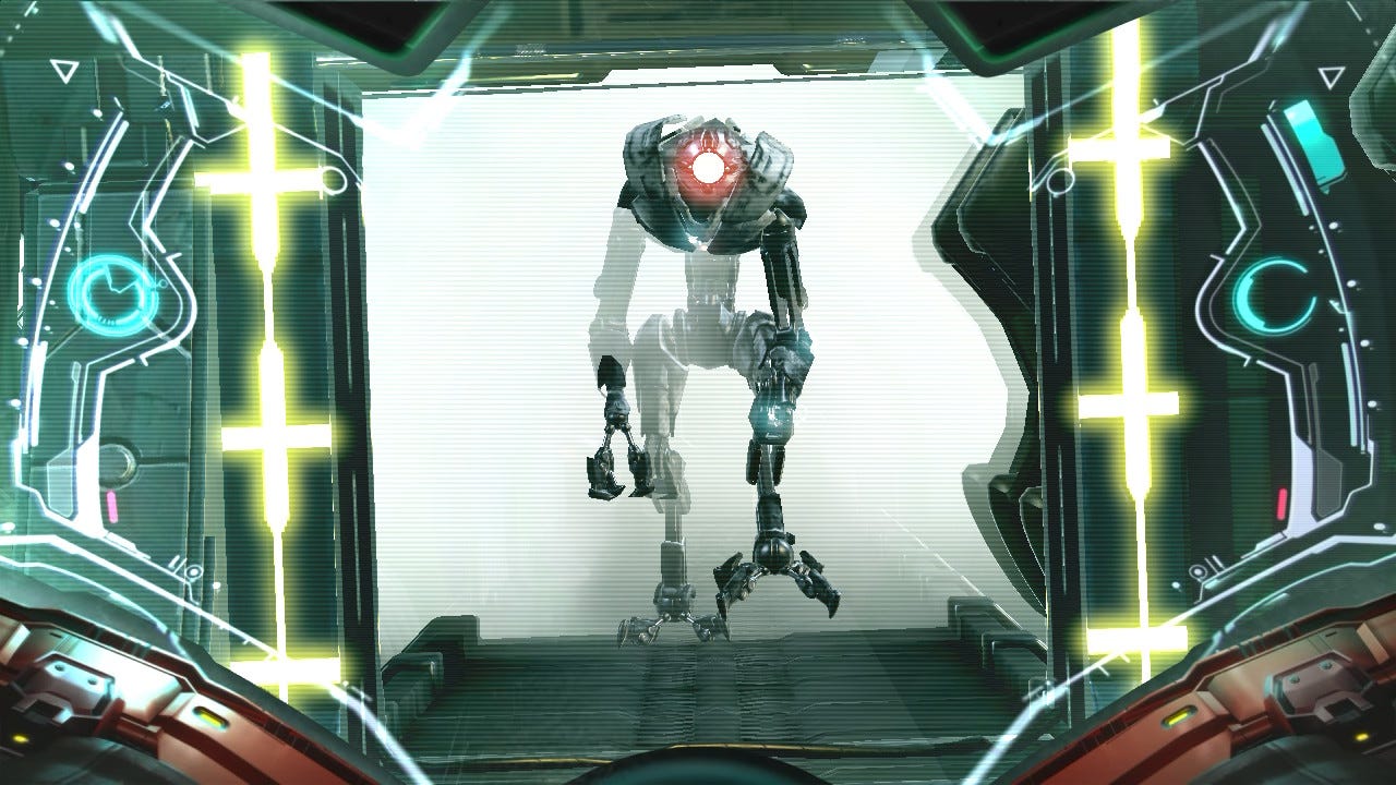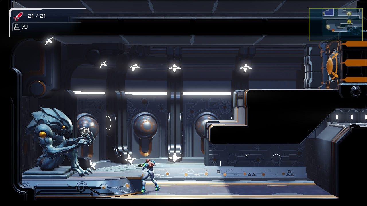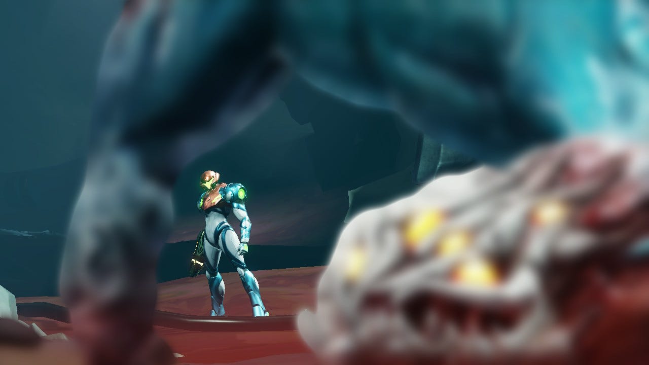 On your way you encounter these E.M.M.I.s, Terminator-like robots you gotta sneak around and avoid because once you’re caught by them that’s it. Unless you can counter their attacks. A little like encountering the SA-X in Fusion except here you stand some chance against them. Eventually you’ll find a method to defeat these E.M.M.I.s, by obtaining an omega cannon temporarily, a weapon powerful enough to not just melt away their faceplates with a rapid fire but completely blow their heads off with a charged shot. It’s a delightful weapon that shares its name with the omega cannon from Metroid Prime Hunters but not the same weapon. For each E.M.M.I. you defeat you gain back another ability be it your morphball, speed booster and shinespark, spider magnet, ice missiles, wave beam and power bomb. Facing off against the E.M.M.I.’s are exhilirating, terrifying, and frustrating. Gradually they get more difficult given what item of Samus they’re using (the blue one that gives you ice missiles can freeze you solid with its tracking beam) and on your first run through while learning not just how these robots work but also how Samus moves and controls and getting the hang of your new aeon abilities— like going invisible for example— facing these terminator robots can be difficult. But they’re never totally unfair in difficulty. If you get caught by an E.M..M.I. you get two chances to parry its attack to escape. Mess up both times and one hit you’re dead. The difficulty here is for each E.M.M.I. and for each instance you get caught the timing on parrying their attacks differs. Some might be quicker than others and some longer, so at first you’re not going to get succesful counters on the robots. You’d counter too soon on a drawn out attack and too late on a quick attack right as you think you know the timing of their attacks. It takes a little time and observation to learn each E.M.M.I.’s attack speeds and for that you’d best develop some patience. Your best bet is to learn your way around the environment so you don’t have to ever come face to face with an E.M.M.I. Using your Phanton Cloak to hide right in front of an E.M.M.I. in your morph ball in a crevice is fun though, it has a lot of anticipation to it. Once you’ve learned how these E.M.M.I.’s work and especially their environments and what routes to take to quickly avoid them you can handle them no problem.