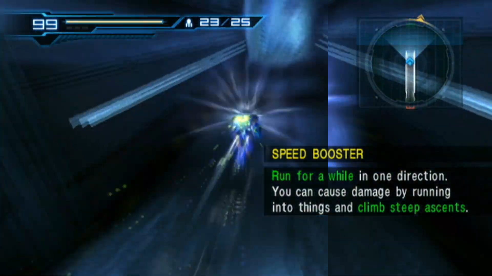 Otherwise, this is probably the most atheltic Samus has ever been in a game. Pressing any direction as an enemy is about to attack, Samus can dodge out of the way with her back jets firing off for an added speed boost, and can quickly charge up her canon to blast them away. And you can duck, roll and backflip out of danger incredibly stylishly and flip into a screw attack to obliterate the enemy. It’s really nice. Naturally you can jump between walls again to climb up to higher platforms, which is much easier to pull off this time around compared to Super Metroid. All you need to do is come into contact with the wall and press 2 and you’re bounding. Even Shinesparking is easier to pull off. Run down a corridor and soon your speed booster will kick in, then either press 2 to immediately launch forward, or stop and hold 2 to charge, release and launch high up into the air, or press 2 and left or right and dash off into a side direction. When you pull it off, especially leaping off to the side, it is so satisfying.
